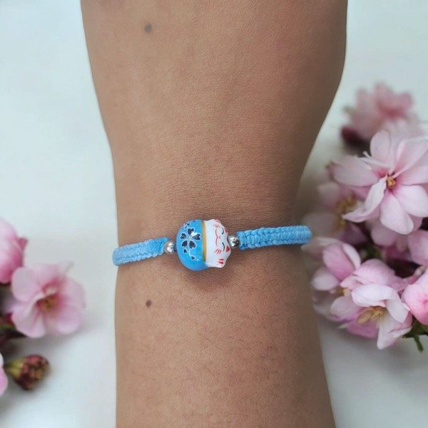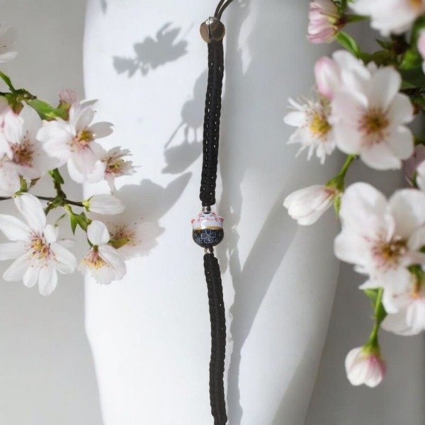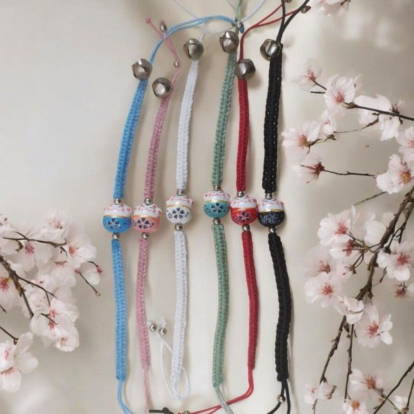 Están tejidas a mano con hilo encerado y llevan un adorable manekineko de porcelana, acompañado por un pequeño cascabel que suena suavemente al moverse.