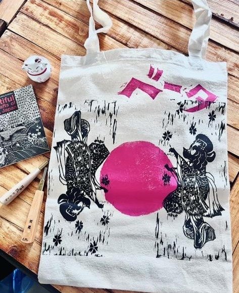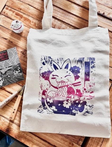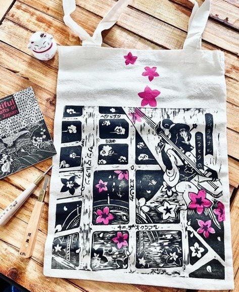 Cada totebag está impresa a mano con la técnica de xilografía, un método tradicional de grabado en madera.